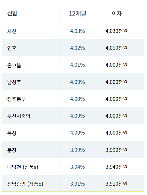 신협 정기예금 금리 중 가장 높은 곳은 '서신신용협동조합'으로 1천만원 12개월 예치 시 4.03%로 상당히 높은 것을 알 수 있습니다.
