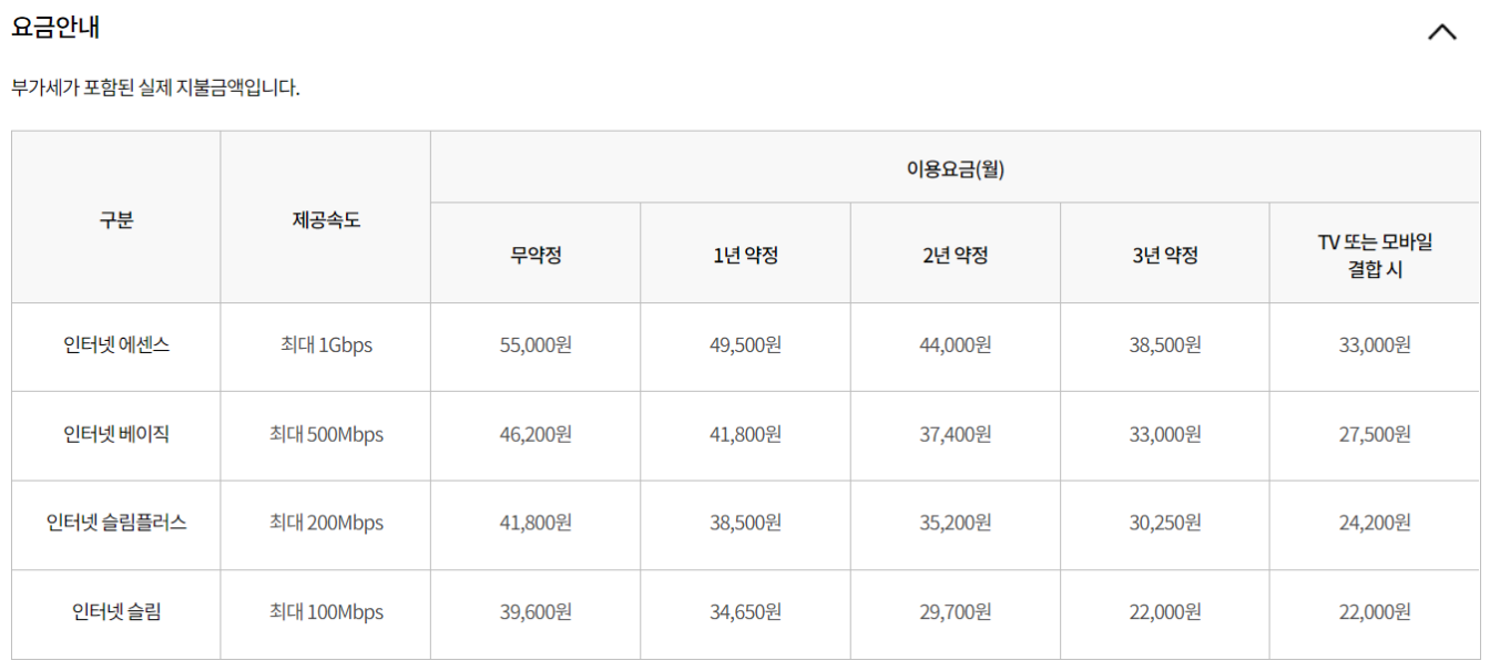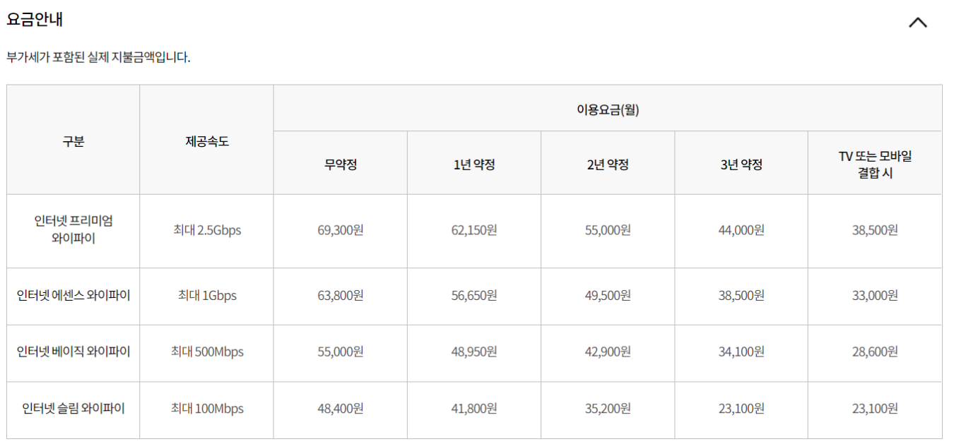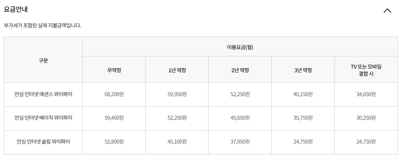 ※ 3년 약정 시, 에센스 요금제를 선택하게 된다면 인터넷만 선택하시는 요금제와 인터넷 WIFI를 선택하는 요금제의 가격이 같은 것을 확인할 수 있습니다. 상당히 큰 혜택이라고 할 수 있겠습니다.