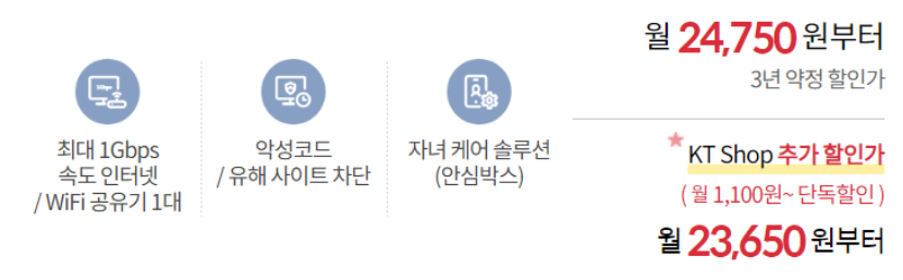 '안심'과 '와이드'의 기능을 모두 갖추고 있는 KT 인터넷 요금제입니다. 프리미엄 요금제를 제외하면 가장 가격이 높은 인터넷 요금제라고 할 수 있습니다.