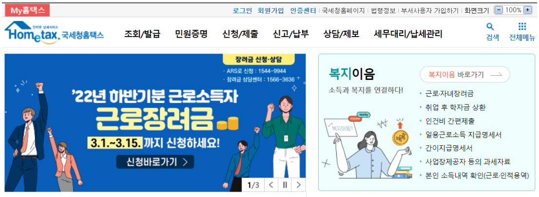 국세청 홈택스 - 로그인 - 신청/제출 - 근로장려금/자녀장려금 - 반기 근로장려금 - 소득자료 확인하기