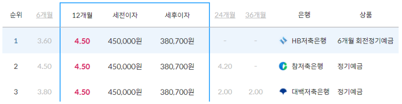 12개월 기준으로 저축은행 정기예금 금리비교를 보면 HB저축은행, 참저축은행, 대백저축은행 3군데가 4.5%로 현재 가장 높습니다. 1000만원을 1년간 예치해 놓으면 세후 이자로 37만원 받을 수 있는 금리입니다. 실시간 예금금리는 아래 저축은행 공식 홈페이지에 모든 순위가 나와있으니 간편하게 확인이 가능합니다.