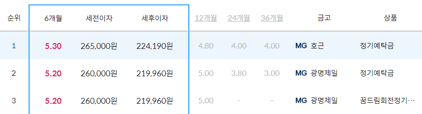 6개월 기준으로 살펴보았을 때는 새마을금고 호근이 5.3%로 1위이고, 광명제일이 5.2%로 높은 금리를 보이고 있네요.