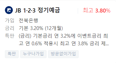 특판상품에 대해 들어보셨나요? 은행에서는 특판상품을 주기적으로 내놓기도 합니다. 현재는 전북은행에서 공격적인 특판 예금을 선보이고 있는데 바로 JB 123 정기예금입니다. 이 정기예금 상품은 최고 3.8%의 금리를 적용받을 수 있는데 이는 금융감독원의 공시된 정기예금 최고 3.6%보다 높은 금리입니다.