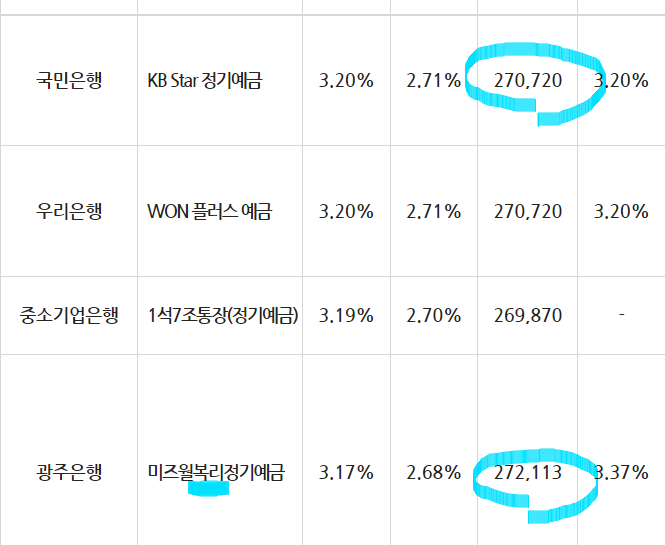 위의 정기예금 금리비교를 천천히 확인해보시면 광주은행의 미즈월복리정기예금의 세전이자율은 3.17%로 국민은행 KB Star 정기예금의 세전이자율 3.20%보다 낮습니다. 하지만 광주은행의 정기예금 상품은 월복리이자를 받기 때문에 세후이자가 국민은행보다 더 높지요. 이처럼 금리 외에 단리상품인지 복리상품인지 확인해보는 지혜도 필요합니다.