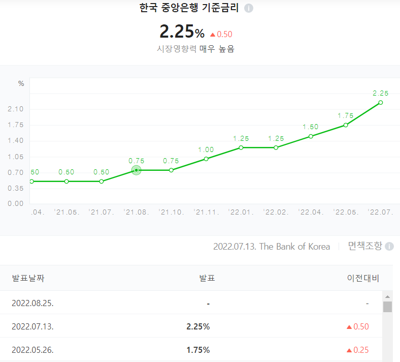 전세계적으로 경기 침체와 인플레이션 이슈가 매일 보도되고 있습니다. 그에 따라 미국 뿐만 아니라 한국에서도 금리인상에 관한 뉴스가 연일 화제가 되고 있습니다. 한국 중앙은행에서는 지난 7월 13일에 기존 기준금리 1.75%에서 0.50% 금리를 인상하여 현재 기준금리는 2.25%가 되었습니다.