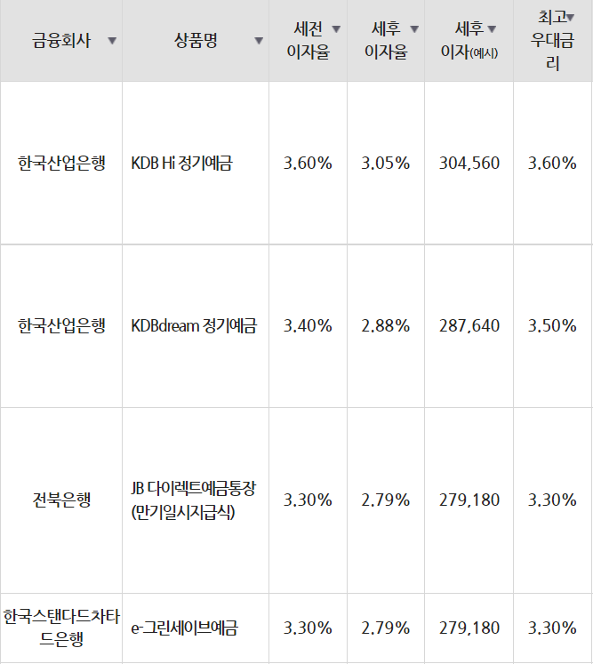 정기예금 금리비교를 보여주는 위의 표는 1년기준 1천만의 저축금액을 기준으로 1금융권의 정기예금 금리를 상세히 비교하고 있습니다. 현재 가장 높은 정기예금 금리의 상품은 한국산업은행의 KDB Hi 정기예금으로 3.60%의 세전이자율을 보이고 있습니다. 산업은행에서 베스트 상품 1위에 오른 상품이기도 합니다.