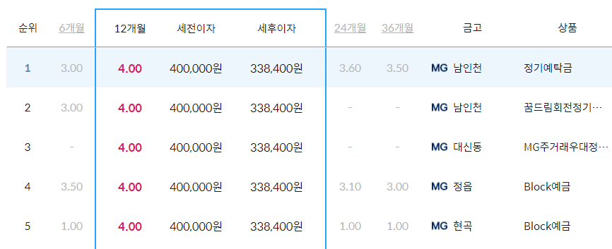 2024년 8월의 12개월 기준 금리를 비교해보면, 새마을금고 예금금리 가장 높은곳은 MG 남인천의 정기예탁금 상품이 4.00%으로 1위입니다. 그 뒤를 대신동, 정읍, 현곡 지점이 뒤잇고 있습니다. 지난달과 비교하여 비슷한 수준으로 유지되고 있습니다.
