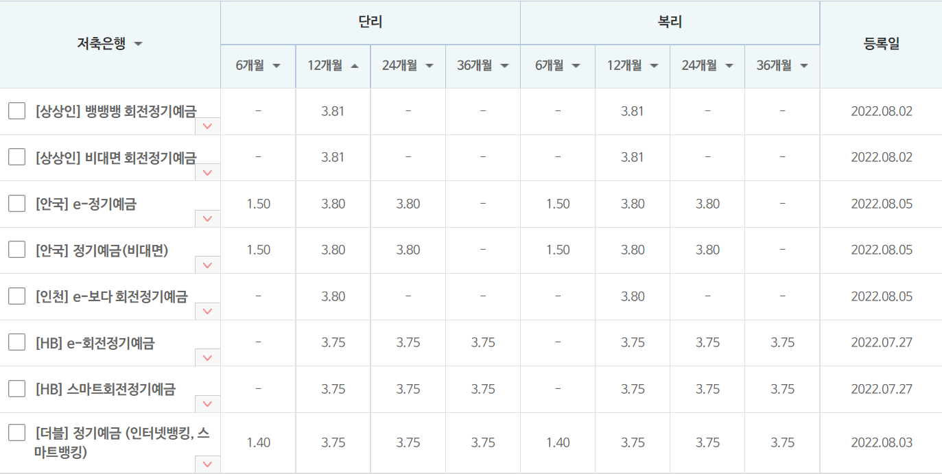 지난 7월 13일에 한국 중앙은행에서 0.50% 금리를 인상하여 현재 기준금리는 2.25%로 2014년 8월의 금리와 동일하게 되었네요. 이에 따라 저축은행 정기예금 금리비교표를 보면 확실히 상승세가 두드러집니다.