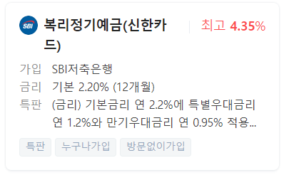 가장 최근에 저축은행 정기예금 금리가 4%를 넘어선 특판 상품으로 주목받은 SBI저축은행의 복리 정기예금상품 또한 금리인상의 신호탄을 제대로 터뜨렸다고 할 수 있겠습니다. 신한카드와 제휴하여 발표된 이 특판상품은 카드 사용실적에 따라 우대금리를 적용받아 최고 4.35%까지 이자지급을 받으니 신한카드 사용자분들에게는 솔깃한 소식이네요.