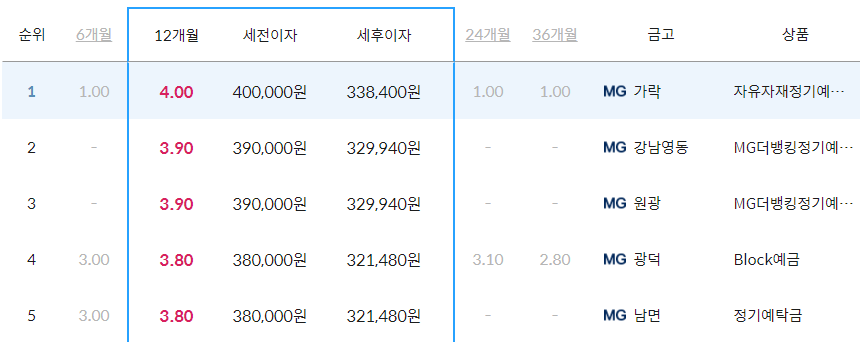 - MG 가락 - 4.00% 금리로 1위이며, 세전 이자는 400,000원, 세후 이자는 338,400원입니다.