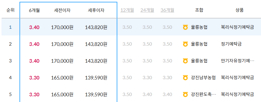| 1 | 3.40 | 170,000 | 143,820 | 울릉농협 | 복리식정기예탁금 |