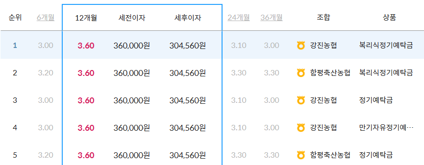 | 1 | 3.60 | 360,000 | 304,560 | 강진농협 | 복리식정기예탁금 |